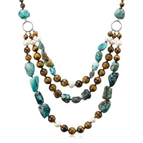 Tiger-Eye, Turquoise and White Freshwater Cultured Pearl Three-Row Necklace w/ Sterling Silver Rings and Extender Clasp